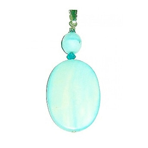 If you like to wear your silver chains but want to add a pop of color, this pendant is for you. It is made up of Swarovski crystals, a mother-of-pearl bead and Czech glass bead. With its silvertone bail, it is 2-1/2 inches.
