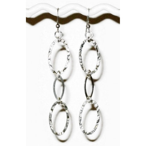 These sterling silver earrings consists of 2 hammered textured ovals with a marquise-shaped components in the center. The earwires they hang on are sterling silver also, and the entire length of the earirngs is 2 3/4 inches.