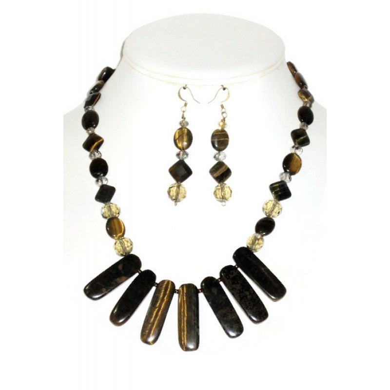 This necklace is made up of an assortment of tiger eye beads, faceted glass beads and crystals. It comes with matching earrings that are 2-3/4 inches long with their gold-tone earwires.