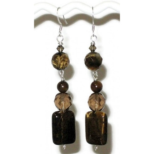 This bracelet is made up of tiger eye beads, smokey quartz chip beads, and Czech glass beads, and it measures 7-1/4 inches with its silvertone lobster claw clasp. The matching dangle earrings consist of tiger eye beads, Czech glass beads and Swarovski crystals, and they are 3 inches long.