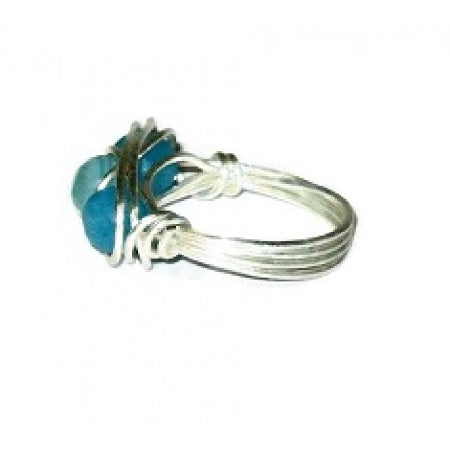 This ring features faceted jade and agate beads wrapped in non-tarnish silver-plated wire. The ring size is 7 3/4.