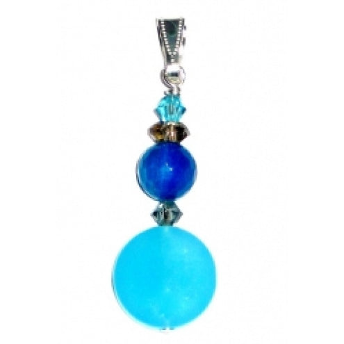 This pendant measures 1-3/4 inches with its silvertone pendant is made up of Peruvian Opal Quartz, crystals, and Sardonyx.