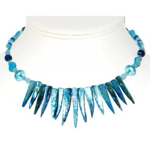 This expandable choker is contains assorted mother-of-pearl beads, faceted Czech glass, crystals and faceted agate.