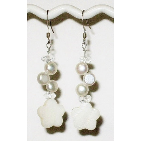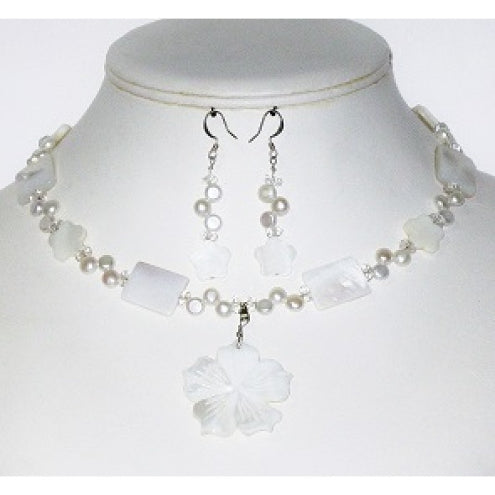 Complement your dress on your special day with this one-of-a-kind necklace. It features a mother-of-pearl flower pendant accented with assorted smooth and faceted mother-of-pearl beads and freshwater pearls. The pendant hangs 1 3/4 inches from the necklace and 1 5/8 inches across. The matching earrings hang 2 1/8 inches starting from the top of the silver-plated earwires.