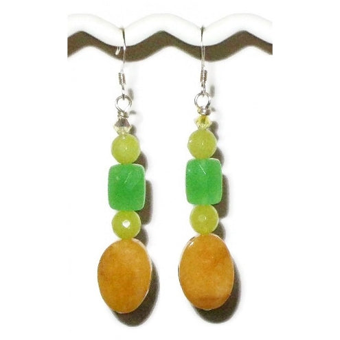 These earrings consist of a mustard colored oval-shaped jade bead, faceted lime round jade beads, Swarovski crystals and faceted chalcedony quartz. They measure approximately 2 3/8 inches, which includes the silver-plated earwires.