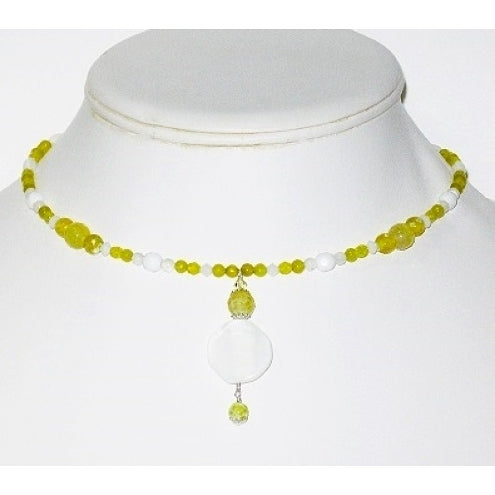 This delicate and stylish yellow and white expandable choker consists of mother-of-pearl, jade beads, Swarovski crystals, faceted agate and Czech glass beads.