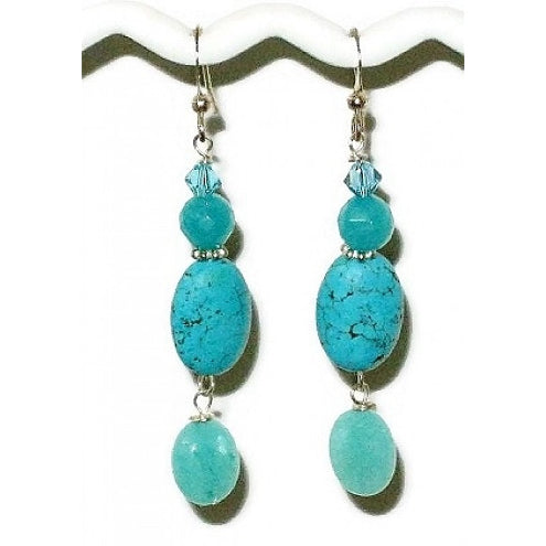 These earrings will give you a nice finishing touch. They contain stabilized turquoise beads, faceted jade and Swarovski crystals. They hang on silver-plated leverbacks and measure 2 1/8 inches in full length.