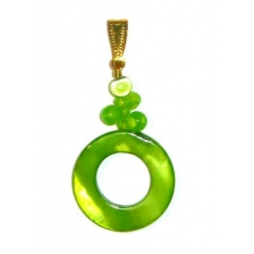 This pendant hangs 1-1/3 inches with its goldtone bail and consists of glass beads and mother-of-pearl.