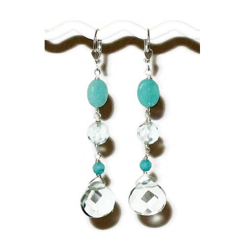 Add a stylish touch to your outfit with these aqua and sea green earrings. They consist of faceted aqua quartz and jade beads. They hang on silver-plated leverbacks, and the full length of the earrings is 2 1/2 inches.