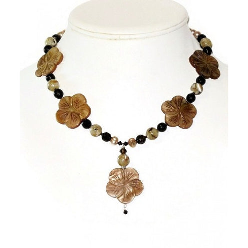 Make a statement with this flower necklace. It consists of mother-of-pearl beads, freshwater pearls, faceted and smooth jade beads and Swarovski crystals. It is finished with a silver-plated lobster clasp, and can be extended from 16 to 18 inches.
