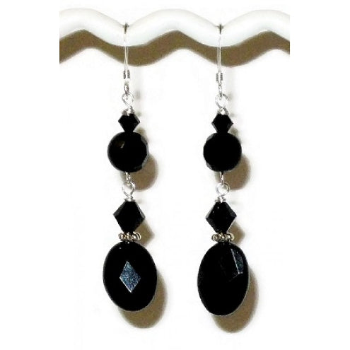 These elegant black dangle earrings consist of faceted black onyx beads and Swarovski crystals.  They measure approximately 2 inches, which include the silver-plated earwires.