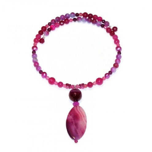 This fancy expandable fuchsia choker features a sardonyx agate drop pendant that hangs approximately 2 3/8 inches from the choker. It is accented with freshwater pearls, Swarovski crystals, and faceted and smooth jade beads.