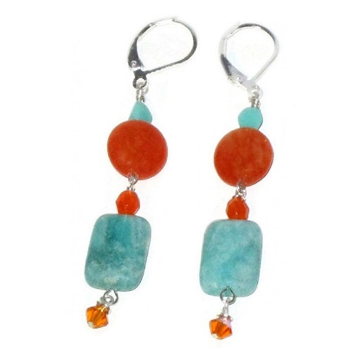 This necklace contains faceted and smooth jade beads, Czech glass and amazonite beads. It has a silver-plated lobster clasp and measures 20 inches. The matching earrings measure 2 1/2 inches starting from the top of the silver-plated leverbacks.