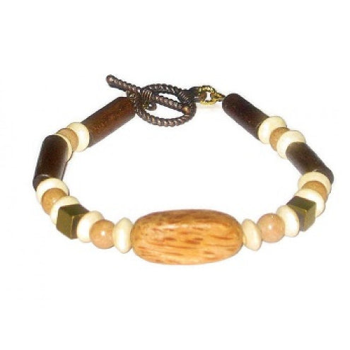 This beaded bracelet, measuring 8-1/2 inches with its antique goldtone toggle clasp, consists of wood beads and semi-precious stones will complete your cool look.