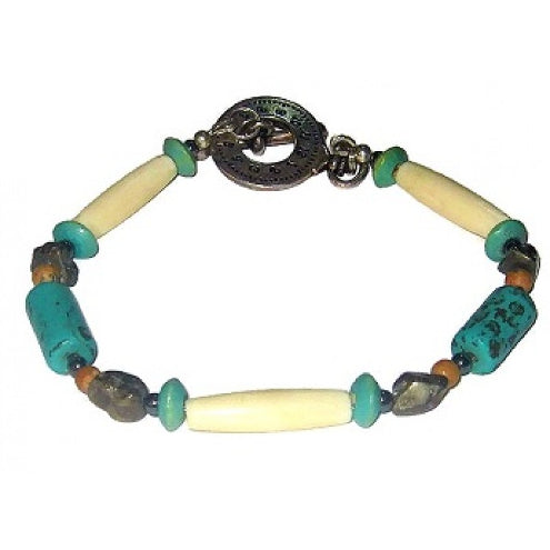 This men's bracelet consists of an assortment of beads like horn pipe, magnesite, wood, hematite and pyrite and measures 8-1/4 inches with its clock toggle clasp.