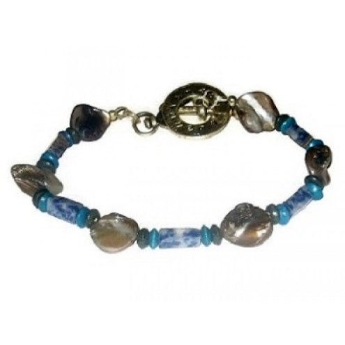 This 9-1/4 inch bracelet is made up of shell stones, wood beads and sodalite stones and has a clock-style toggle clasp that gives the bracelet extra detail.