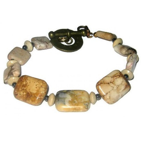 This 8-1/2 inch bracelet consists of wood, magnesite and hematite beads and it fastens with a clock toggle clasp.