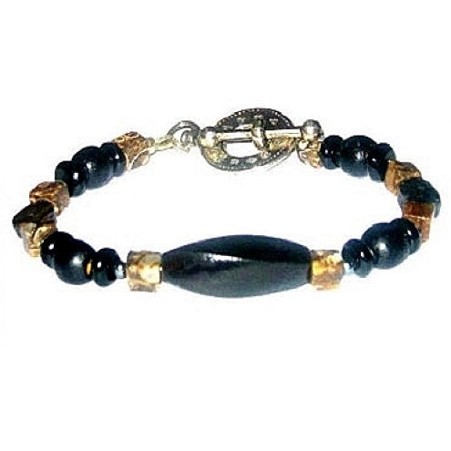 This bracelet is sure to add extra swag to an outfit. It consists of wood beads and semi-precious stones, such as jasper, onyx and hematite. It measures 8-1/4 inches with its silvertone clock toggle clasp.