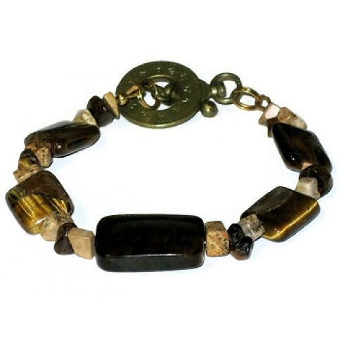 This bracelet measures 8 inches with its clock-style toggle clasp and consists of tiger eye beads and jasper beads. The tiger eye beads have different hues of brown in them depending on how the light hits them.
