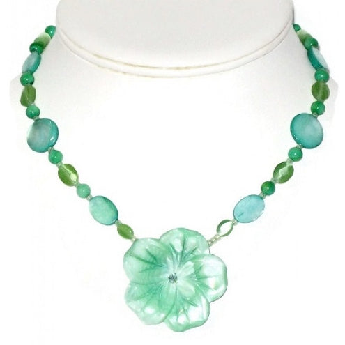 Mint and Apple Green Necklace with Mother-of-Pearl Shell Flower Pendant