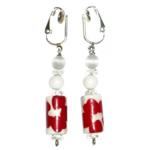 White and Red Porcelain Clip-On Earrings with Flower Design