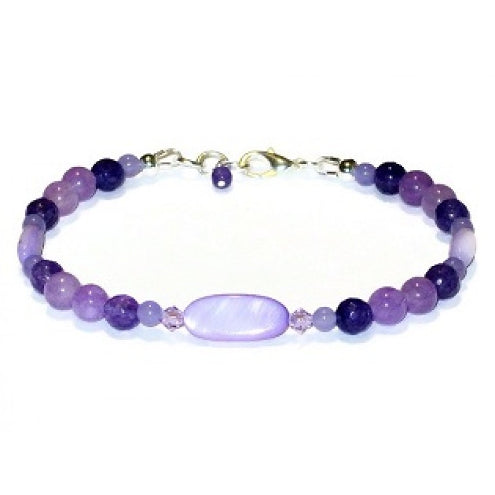 The different shades of purple in this delicate bracelet will highlight any outfit. It is made up of mother-of-pearl beads Swarovski crystals, and faceted and smooth jade beads. It has a silver-plated lobster clasp and short extender which allows you to adjusted the bracelet from 7 1/4 to 7 3/4 inches.