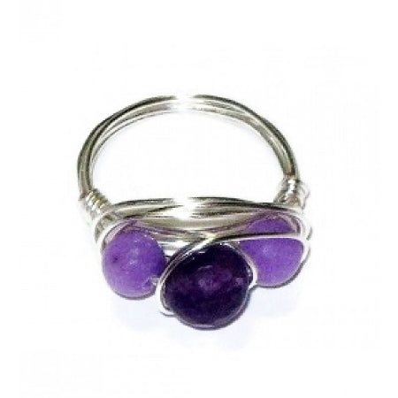 This ring contains three jade beads but the center bead is deeper shade of purple and is faceted. It is wrapped in non-tarnish silver-plated wire. The ring size is 8.