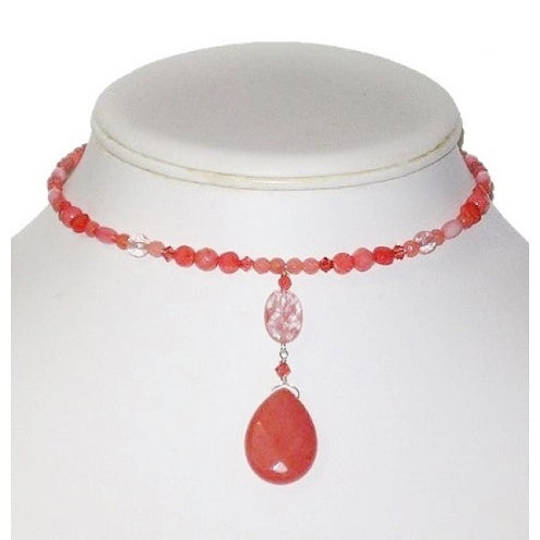 Red Peach, Coral and Pink Choker with Faceted Briolette Pendant