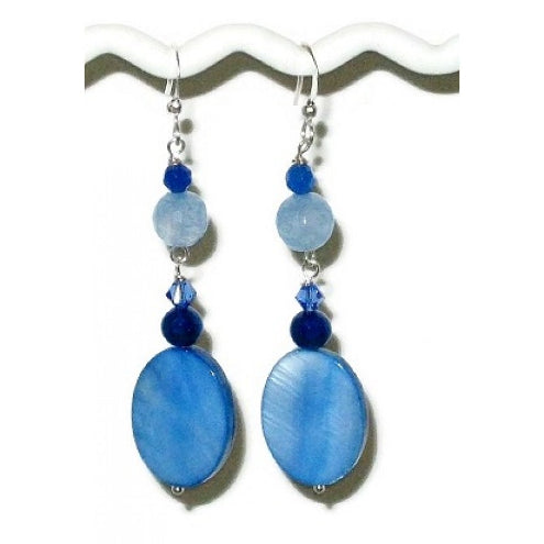 These earrings contain mother-of-pearl beads, freshwater pearls, Swarovski crystals and faceted jade. They measure 2 5/8 inches starting from the top of the silver-plated earwires.